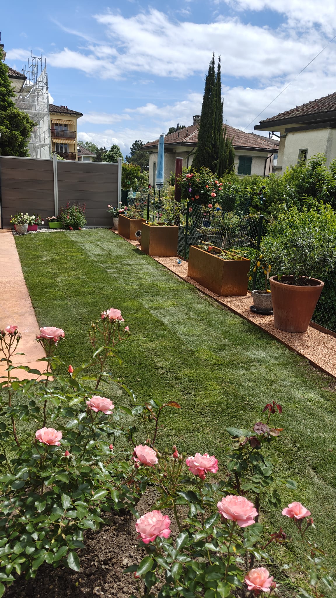 Un exemple d'aménagement avec : gazon de plaquage, création d'un massif en gravier coloré, bacs en acier 'corten' et plantations de plusieurs espèces.